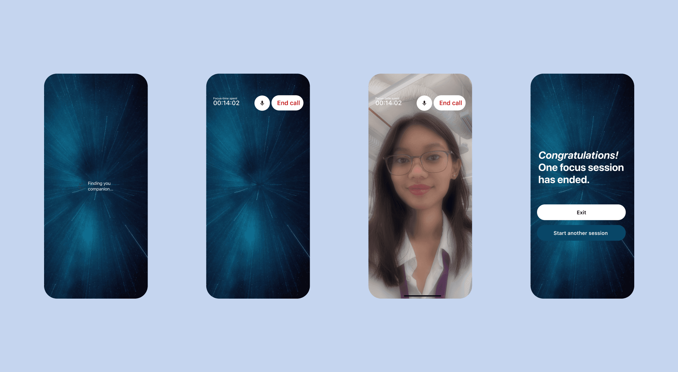 Users are matched for focused sessions via voice or video calls, allowing them to work on their own tasks in the presence of another. By addressing the emotional roots of procrastination—loneliness and being overwhelmed—Companion acts as a quiet, supportive "focus buddy" to help users get through their day, one task at a time.