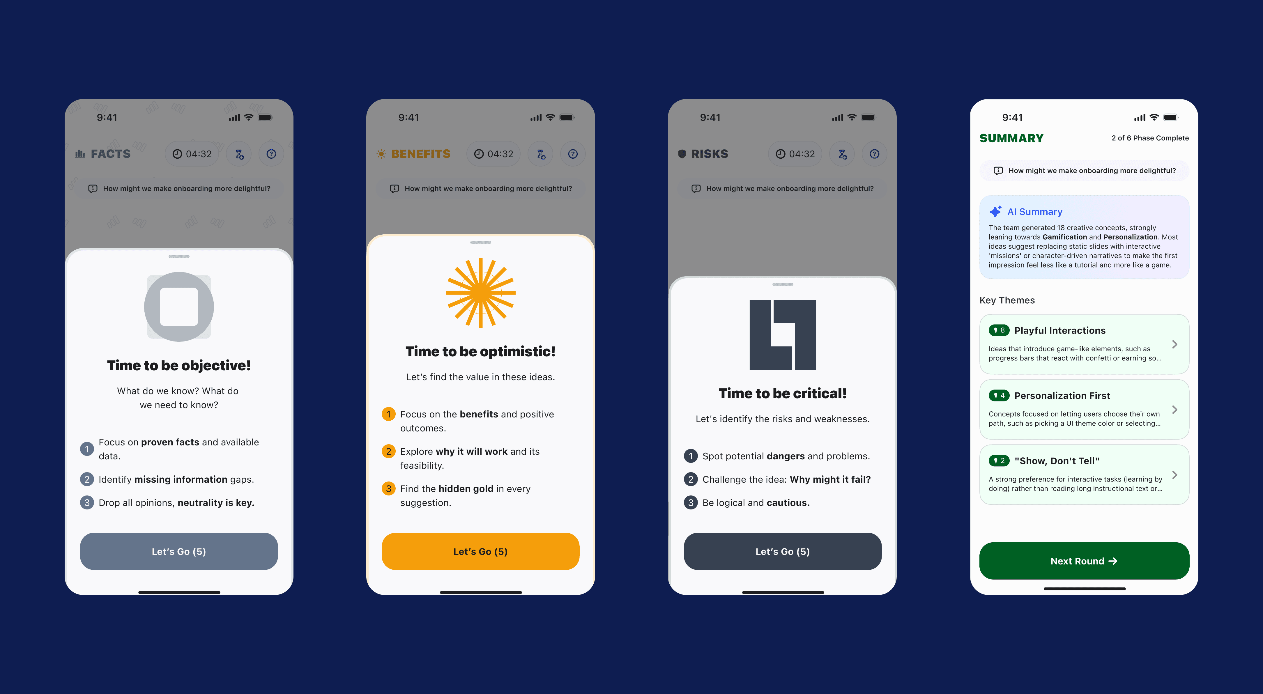 Since we were inspired by Six Thinking Hats method, the primary challenge was how to implement and make the flow both clear and intuitive for the user, especially for those who has never practiced Six Thinking Hats method before, so we can lessen the cognitive load of the ideation process. The product required structured multi-round workflows, role-based session control, also a database architecture that supports idea generation and iterative feedback. Designing it means balancing UX clarity, system logic, and behavioral dynamics within a team setting.